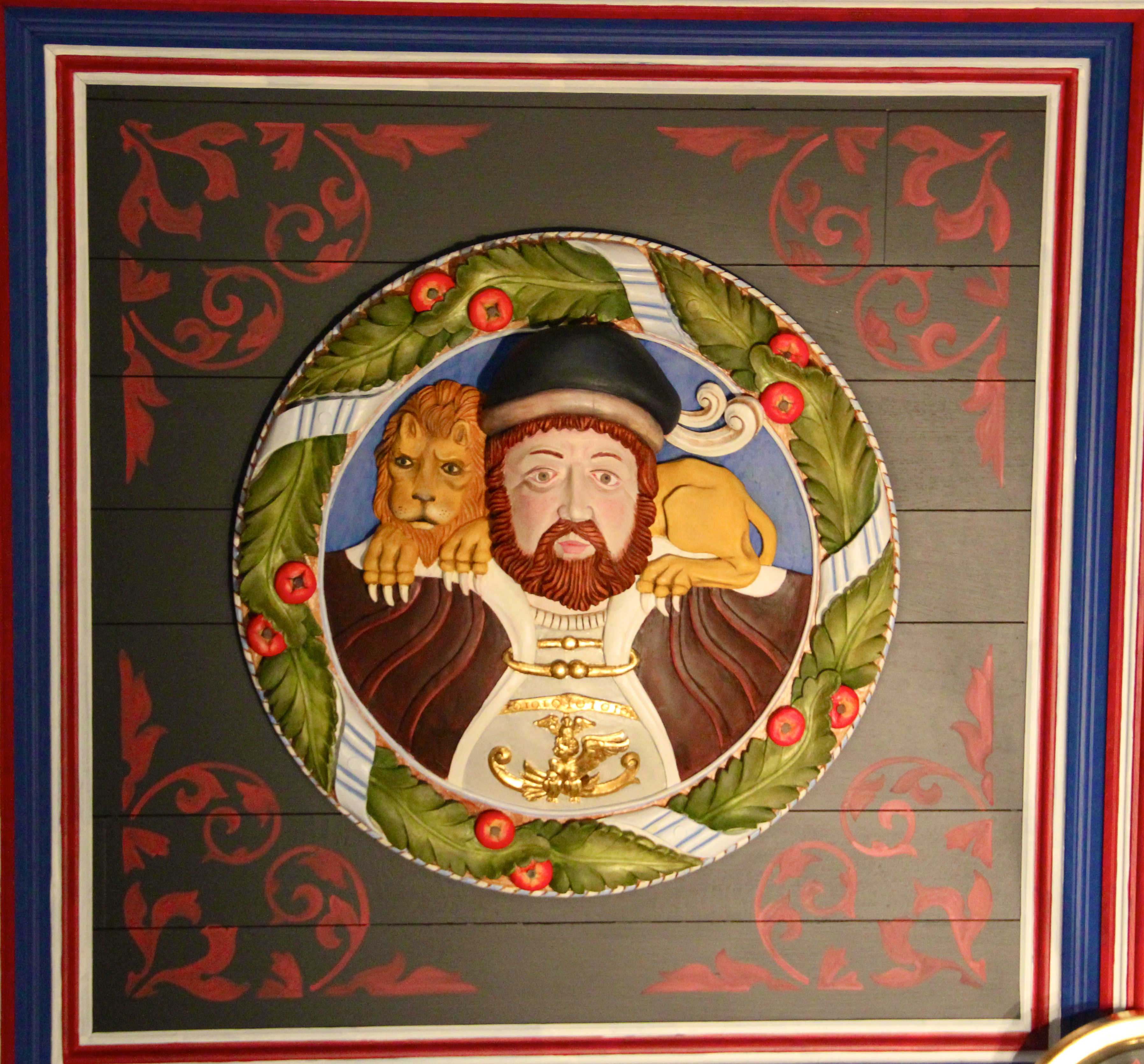 The ceiling is regarded as one of the finest Renaissance architecture in existence. In 1777 the ceiling in the chamber ceiling collapsed and the heads were removed. Only 38 of the original 56 heads survived.